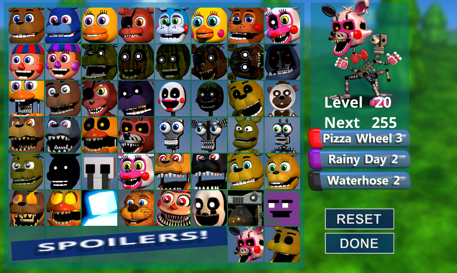 The GameJolt version changed the world graphics from 2D to 3D. As of Version 1.2, the player is able to travel to a new land, to play the minigames of characters whose codes are being recycled for other games to unlock new characters after the player completes the sets of minigames in a range of modes. These include 'Foxy Fighters', 'Chica's Magic Rainbow', 'Foxy.EXE' and 'FNAF 57: Freddy in Space'.